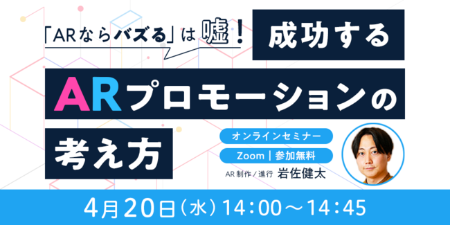 ARサービスを展開するアララ株式会社(本社:東京都港区、代表取締役社長:岩井 陽介、証券コード:4015、以下「アララ」)は、ARプロモーションを成功させるために必要なポイントを解説するWEBセミナー「『ARを使えばバズる』は嘘!成功するARプロモーションの考え方」を4月20日(水)に開催いたします。
