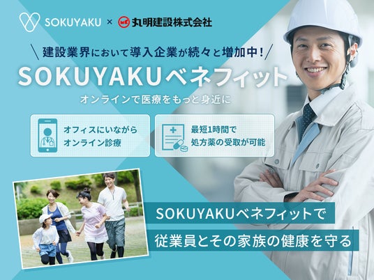 ジェイフロンティア株式会社(本社:東京都渋谷区、代表者:代表取締役社長執行役員 中村篤弘、以下「当社」)は、当社が提供するオンライン診療・服薬指導・処方薬配送サービス「SOKUYAKU(ソクヤク)」の利用が可能になる、従業員への福利厚生サービス「SOKUYAKUベネフィット」が、ISO認証取得や資格取得支援の下、高品質・安全・地域貢献を軸に土木、建築、解体、舗装、水道工事など公共・民間工事を広く手掛け、1889年の創業以来、静岡で長く信頼を築いてきた丸明建設株式会社(本社:静岡県袋井市、代表取締役社長:井谷 晋之輔)に導入されたことをお知らせいたします。