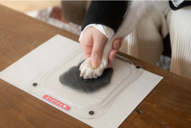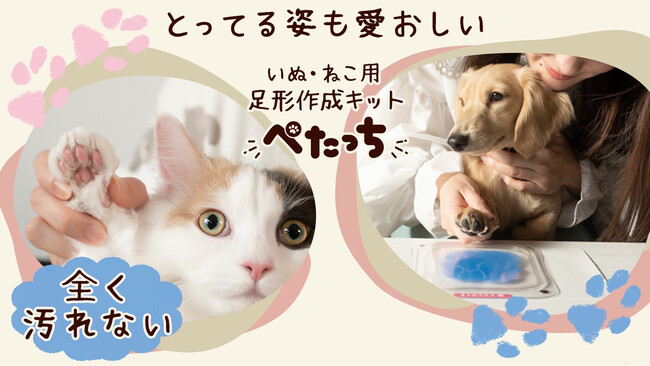 「ぺたっち」は、わんちゃん・ねこちゃんの肉球を汚すことなく足形がとれる新感覚のキットです。インキを直接肉球に付けるのではなく、インキが下に塗られたフィルムの上から足形を押すことで、直接インキに触れずに紙に足形を残せます。足にインキを塗らないので大切なペットやお部屋を汚す心配なく、思い出を彩る作品づくりを楽しむことができます。