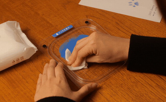 シヤチハタはこれまで「しるしの価値」を追求し続けてきました。足形や手形で表す「しるし」も一つの「しるしの価値」だと考えています。そして、「しるし」自体はもちろん、「しるしをとる行為」自体も価値あるものにしたいと考えました。作品づくりはもちろん、そのプロセスも楽しんでもらうため、汚れないこと、繰り返し使えることが重要であると考え、フィルムの厚みや性質、インキの配合など、検討を重ねて商品化しました。