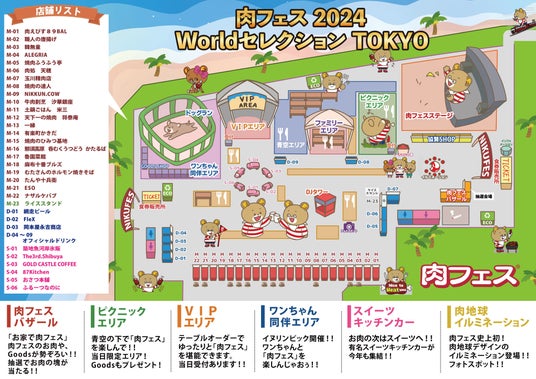 「肉フェス」を待ちきれないみ皆さまの為に、会場のマップをご紹介します。お目当ての店舗やエリア、コラボコンテンツの場所を事前に予習して、最適な店舗の回り方や利用コンテンツのシミュレーションとしてご利用ください。また、お連れのご友人やお子様とはぐれないように気をつけて、「肉フェス」をお楽しみください。