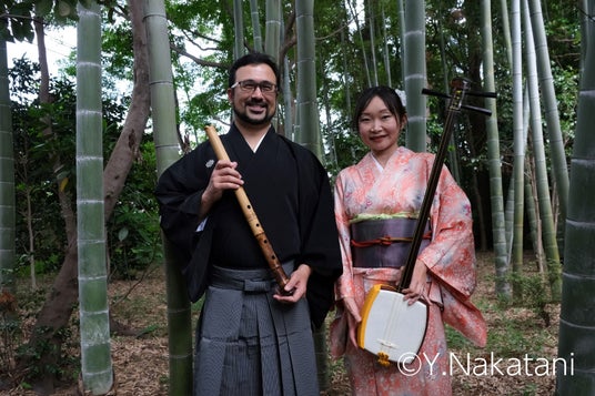 尺八奏者 東京音楽大学付属民族音楽研究所講師 渕上ラファエル広志さん(ブラジル出身 日系三世)(左)と三味線奏者 奥様の満梨さん(ブラジル出身 日系三世)(右)2023.05.28東京都内にて (C)Yoshitaka Nakatani