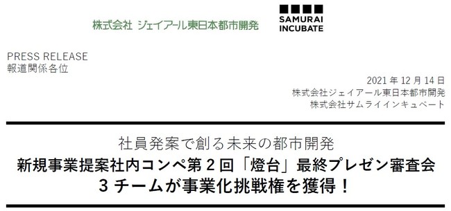 株式会社ジェイアール東日本都市開発(本社:東京都渋谷区、代表取締役社長:出口 秀已、以下 ジェイアール東日本都市開発 )と株式会社サムライインキュベート(本社:東京都港区、代表取締役:榊原 健太郎、以下:サムライインキュベート)は、新規事業提案社内コンペ第二回「燈台」の最終プレゼン審査会を2021年12月10日(金)に実施いたしました。そしてこの度、夫婦の育児自立支援を提案する『新生児育児 産後サポート』、出張・移動販売車で実現する日替わりマルシェを提案する『ToMARUCA(トマルカ)』、キャンプ初心者のファーストステップ支援を提案する『高架下キャンプ練習場』の3つの事業案が事業化挑戦権を獲得いたしました。