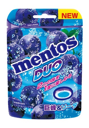 「メントスDUO 巨峰&ソーダ」は、外側はカリッとした食感と濃厚でジューシーな巨峰味、内側は爽快なソーダの味わいが広がる、新フレーバーです。巨峰とソーダの絶妙なハーモニーが楽しめます。開閉可能なジッパー付きの小袋なので、持ち運びにも便利です。