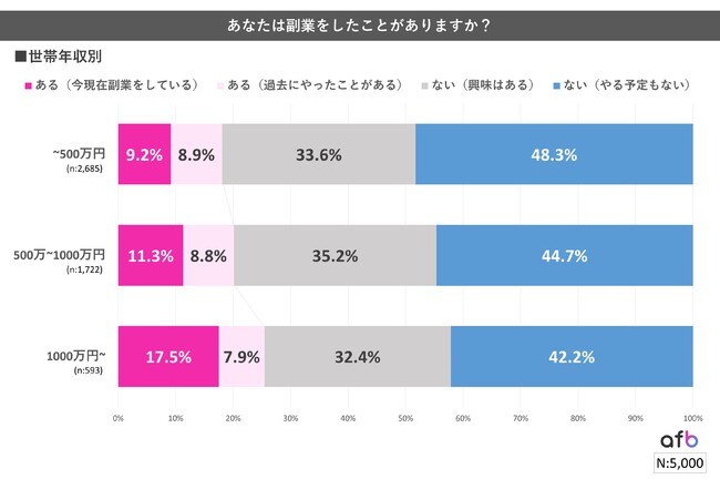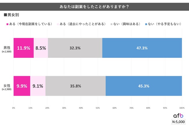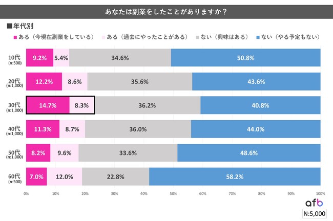 パフォーマンステクノロジーネットワーク「afb(アフィビー)」< https://www.afi-b.com/ >の開発運用をおこなう株式会社フォーイットは、全国の10代~60代までの男女5,000人を対象に副業に関するアンケートを実施し、年代別・世帯年収別等の特徴についてまとめました。