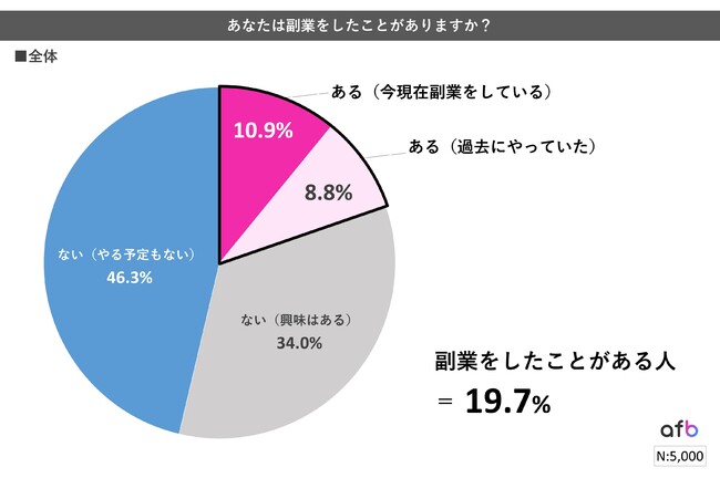 全国の10代~60代の男女5,000人を対象とした「あなたは副業をしたことがありますか?」というアンケートを行ったところ、「ある」と回答した方は19.7%という結果になりました。