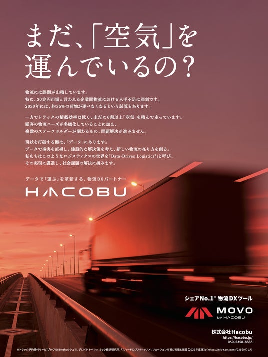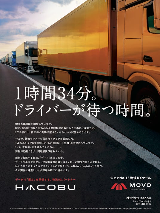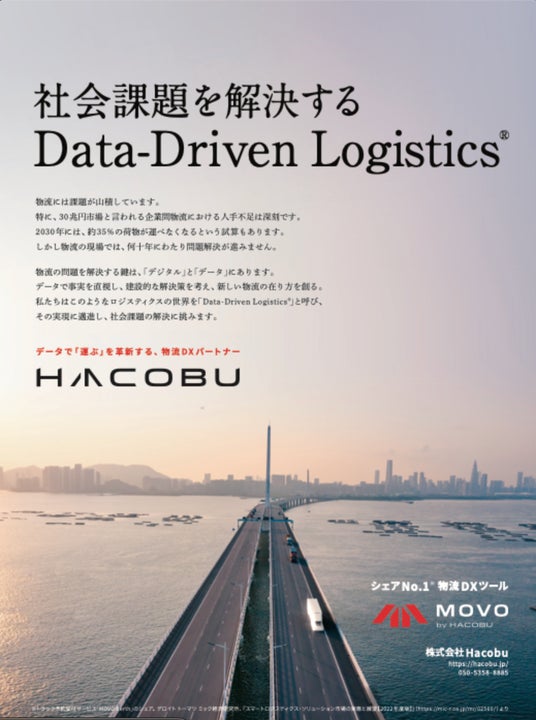 データの力で物流課題を解決する株式会社Hacobu(ハコブ、本社:東京都港区、代表取締役社長CEO 佐々木太郎、以下「Hacobu」)は、物流「2024年問題」をテーマとした当社の企業広告が、第66回「日本雑誌広告賞」においてシリーズ広告部門金賞を受賞したことをお知らせいたします。