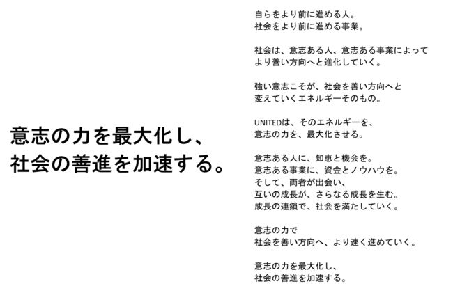 ユナイテッドは「意志の力を最大化し、社会の善進を加速する。」というパーパスに基づいて企業活動を行い、持続的な成長とともに、社会をより善い方向へ進めることに貢献してまいります。
