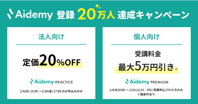 この度、Aidemyの累計ユーザー数20万人突破の感謝をユーザーの皆さまに伝えるとともに、AI/DX・GX人材の育成や機械学習モデルの運用に課題を抱える法人のお客様、ならびにAIプログラミングスキルを習得しキャリアアップを目指す個人のお客様へ、さらなる学習支援と機会の提供拡大をすべく、記念キャンペーンを実施いたします。