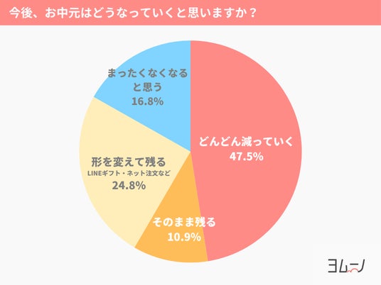 「どんどん減っていく」と答えた方が47.5%と最多となりました。次いで「形を変えて残る(LINEギフト・ネット注文など)」が24.8%と、約4人に1人が“デジタル化・簡略化”による継続を予想しています。