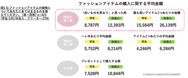 Z世代が「良いものを買おう」と思った時に購入するファッションアイテムの平均金額※図1は、大学生が8,787円、社会人が12,393円、今まで購入した中で最も高いファッションアイテムの平均金額は、大学生が15,564円、社会人が26,139円となりました。