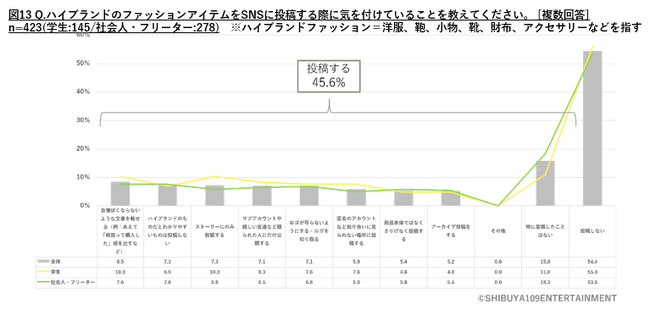 ハイブランドのファッションアイテムをSNSに投稿する※図13のは45.6%で、グループインタビューでは女性の中から「コスメなら気にならないが、ファッションアイテムはInstagramの親しい友達設定、あるいはサブアカウントのストーリーズに投稿」「『どうしてそんなにブランド品を持っているの?』と色々と詮索されたら怖い」「『お金を貯めてやっと購入!』など、頑張って購入した感じの文章を載せることで、自慢っぽさを軽減させている」「親と共有で使っているPRADAのバッグは、ロゴが写っていない写真を選んで投稿する」など、周りからの見え方を気にする声が聞かれました。