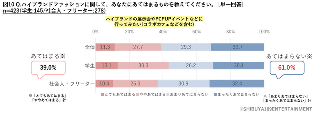 Z世代の約4割がハイブランドの展示会やPOPUPイベントなどに行ってみたい※図10と回答し、グループインタビューでは、「DIORの香水のイベントに行った。今まで自分が思っていたブランドイメージが具現化された空間だと思った」「GUCCIのポップアップに行って、世界観が独特で良いなと思った」「ブランドのイメージが伝わってきて、自分の中での価値が変わった」など、世界観を体験として感じることを楽しんでいる様子が聞かれました。