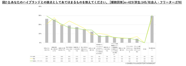 ハイブランドとの接点※図2について聞いてみると「SNS上でよく目にする(26.5%)」「店舗の前を通った際に目にする(25.5%)」「店舗の中で商品を目にする(19.9%)」という回答が多く上がった一方、最も多い回答は「特に接点はない(29.6%)」になりました。