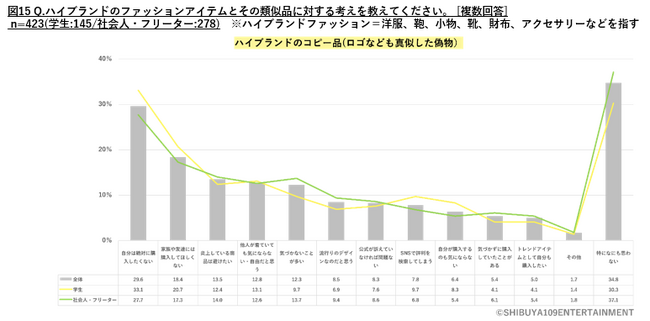 最後にコピー品や模倣品について、購入したことがある※図14のは25.1%となりました。コピー品に関しては「絶対に購入したくない(29.6%)」「家族や友達には購入してほしくない(18.4%)」「炎上している商品は避けたい(13.5%)」※図15などの声が聞かれました。グループインタビューでも、「自分は手を出さない。友達に見せた時に、偽物だとバレたら恥ずかしい」「他人が着ていても何も思わないが、コピーと知っていて着ているのを見ると、そんなに無理しなくても良いのにと思う」などの声が聞かれました。