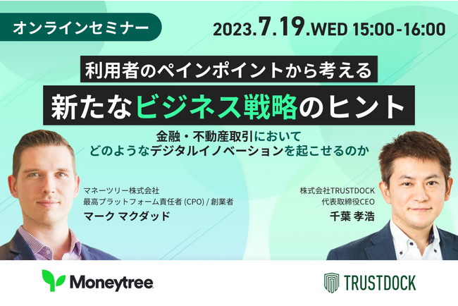 株式会社TRUSTDOCK(本社:東京都千代田区、代表取締役:千葉 孝浩、以下TRUSTDOCK)とマネーツリー株式会社(本社:東京都港区、代表取締役社長:ポール チャップマン)は、無料ウェビナー「利用者のペインポイントから考える新たなビジネス戦略のヒント ~金融・不動産取引においてどのようなデジタルイノベーションを起こせるのか~」を2023年7月19日(水)に開催いたします。