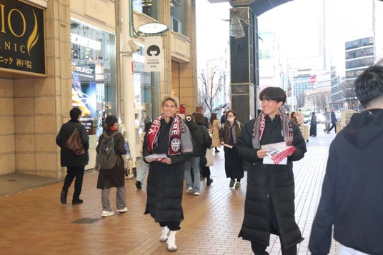 三宮センター街、元町商店街、そして和田岬駅周辺の3ヶ所で実施された今回のプロモーション活動には、ヴィッセル神戸の選手たちも積極的に参加。小松蓮選手、冨永虹七選手、山田海斗選手、濱崎健斗選手、瀬口大翔選手が元町商店街にて約1時間にわたり、地域住民の皆さまへ直接チラシを手渡しました。
