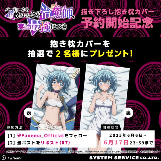 TVアニメ『パーティーから追放されたその治癒師、実は最強につき』新商品「抱き枕カバー」の予約開始を記念して、X(旧Twitter)フォロー&リポスト(RT)キャンペーンを実施いたします。