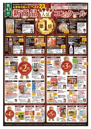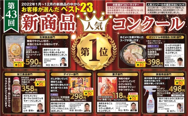 2022年1月から12月の期間中に新発売された商品の中から、新商品人気コンクールの候補商品として、対象期間中における売上上位商品を5つの部門と今回より新設した「オリジナル半調理品(生鮮)」部門に選出し、弊社お客様モニターにより全候補商品を試食・試用していただいた後、投票で決定しています。