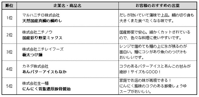 入賞商品はサミットで昨年1年間に販売した新商品の中から、サミット消費者モニター約90名による人気投票で順位を決定したものです。入賞商品は2月8日からチラシによる紹介セールを実施いたします。
