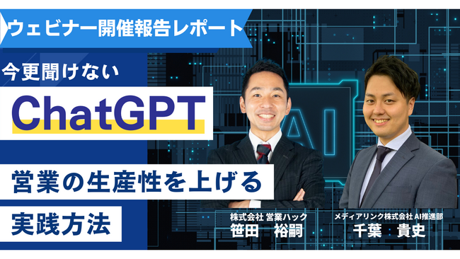 株式会社営業ハック(本社:東京都港区・代表:笹田裕嗣)とメディアリンク株式会社 (本社:東京都港区・代表:松本 淳志)が共催ウェビナーを行いました。日時は2023年5月9日(火)12:00~13:00、参加費は無料。最近、新聞でもニュースでもSNSでも、ChatGPTの言葉が飛び交っています。ChatGPTを活用したWebサービスも毎日のようにリリースされている状況で、この最新のAIを「営業」にどう活用できるのか。活用することでどのようなメリットがあるのか。 ChatGPTのプロをお招きして詳しく解説させていただきました!
