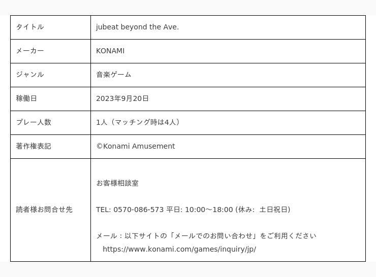 株式会社コナミアミューズメントは、アミューズメント施設向け音楽ゲーム『jubeat』(ユビート)シリーズにて、シリーズ12作目の最新作『jubeat beyond the Ave.』(ユビート ビヨンド ジ アべニュー)が9月20日(水)より稼働開始したことをお知らせします。
