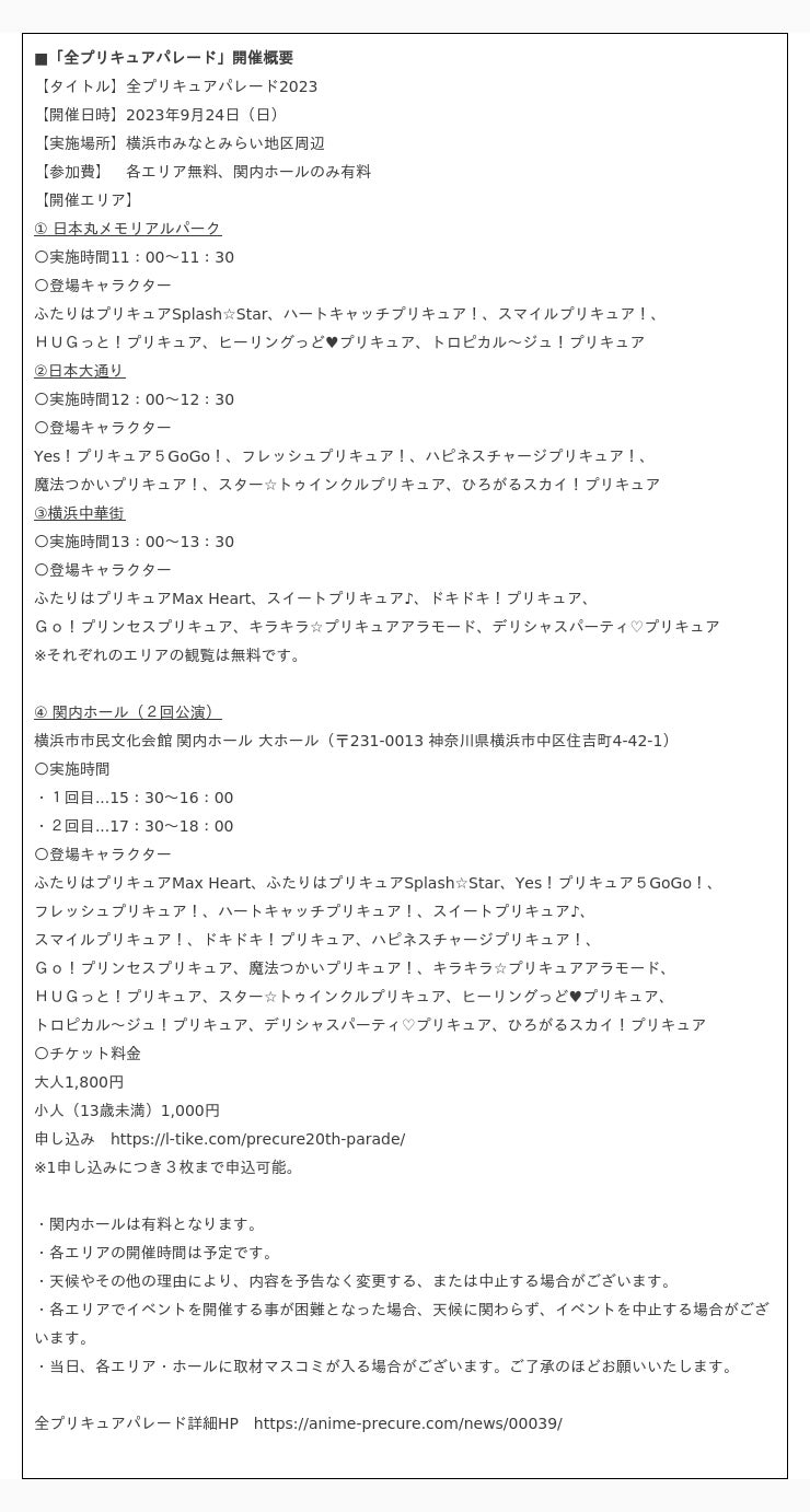 2004年からスタートしたTVアニメ「プリキュア」シリーズ。放送20作品目を迎えた2023年2月から記念すべき年・プリキュア20周年として、様々な展開を見せていますが、9月24日(日)に横浜エリアで開催をする「全プリキュアパレード2023」の詳細が発表となりました。