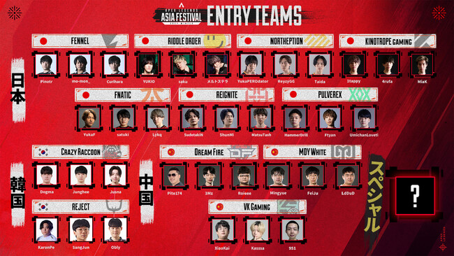 日本:FENNEL/FNATIC/PULVEREX/RIDDLE ORDER/REIGNITE/KINOTROPE gaming/NORTHEPTION(他2チームはPlayalive、ESCLで決定)