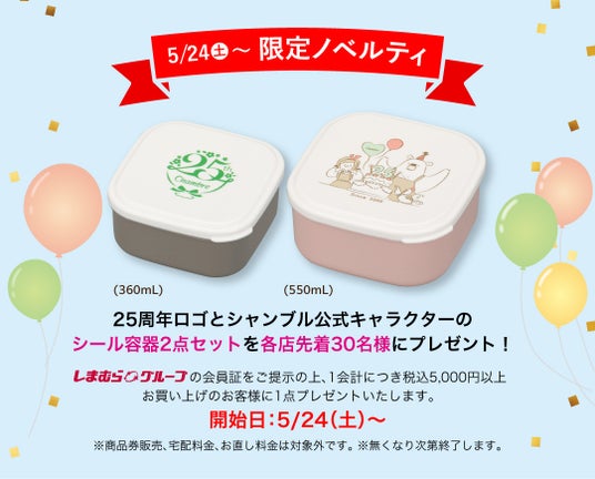 しまむらグループの会員証をご提示の上、1会計につき税込5,000円以上お買い上げのお客様に、各店先着30名様限定で、25周年を記念したシャンブルオリジナルデザインの「シール容器2点セット」をプレゼントします。