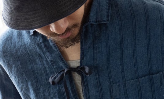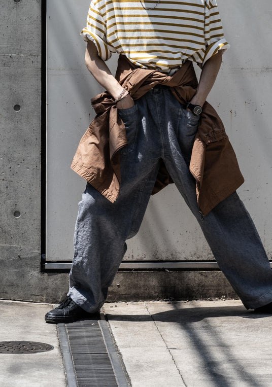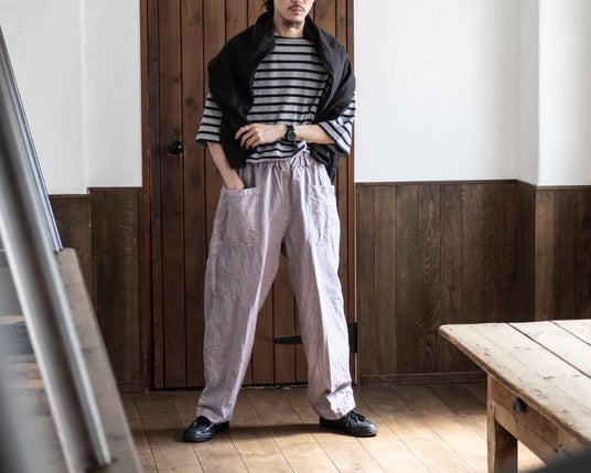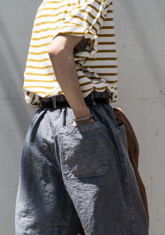 何十年もの時間を経た色褪せた古物には、それ独自の魅力があることに着眼し、ブランドで繰り返し表現しているピグメント染めを採用。洗うたびに色落ちはありますが、自分の手で育てる唯一無二を期待して、愛用いただければと思います。