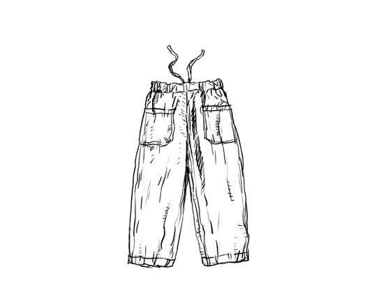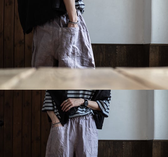 U.S.Nのデッキパンツにあるポケットワークを参考にしつつも、普段使いのしやすさを重視して作り上げた一本。全体的なフォルムに膨らみをもたらす為、リネン和紙の高密度ファブリックを用いました。