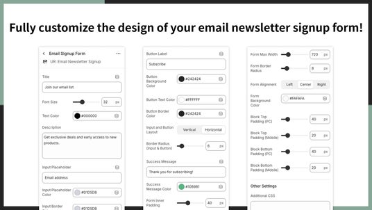 UR: Email Newsletter Signup は、ホーム・コレクション・商品ページなど任意のページに、デザイン性の高いメルマガ登録フォームを追加できるノーコードアプリです。