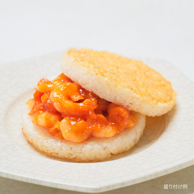 国内モスバーガーで販売した「海老チリ風バーガー」をヒントにした、バナメイ海老に特製エビチリソースを絡めた商品です。エビチリソースにはトマトケチャップを2種類使用し、トマトの濃厚さと酸味のバランスを取りました。また、隠し味に甘酒を加えることでコクと甘み、旨みを補強しています。さらに、食感を出すため、ダイスカットにした野菜(レンコンの水煮、ニンジン、白葱、玉ねぎ)を配合しています。