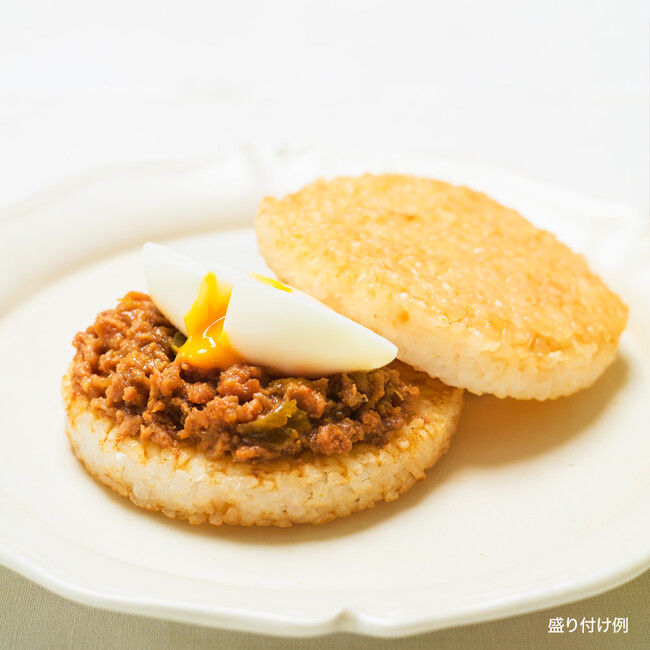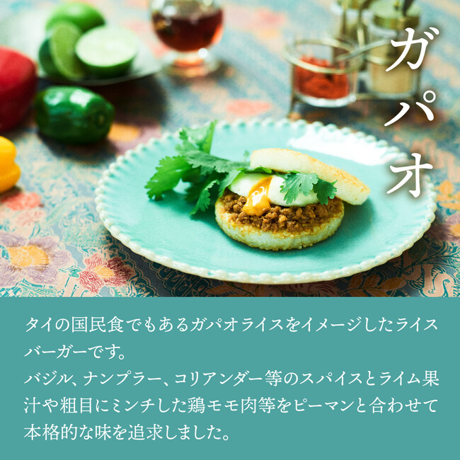 海外モスバーガーでも人気商品だったガパオライスバーガーを日本風にアレンジし、冷凍モスライスバーガーとして仕立てました。味付けはタイモスバーガー及びタイの国民食でもあるガパオライスをベースにバジルのパウダーを使用して香りを出し、ナンプラー、コリアンダー、青唐辛子パウダー、ライム果汁や鶏モモ肉を粗目(8mm)にミンチしピーマンと合わせ本格的な味を追求しています。とろ~りとした半熟風たまごも楽しめる、辛さと旨みが特徴のガパオライスバーガーです。