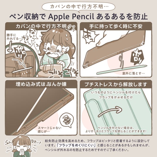 ApplePencil 第2世代 (アップルペンシル 第2世代)の磁気吸着無線充電にも対応しています。ペンシルを吸着させ、その上からフラップを閉じることができるので、ペンシルを紛失しにくくなります。その他、オートスリープ/ウェイク機能にも対応。【2WAYスタンド機能】