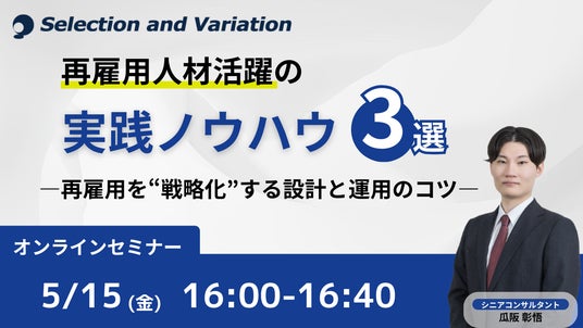 組織・人事コンサルティングファームであるセレクションアンドバリエーション株式会社(以下、当社、東京都千代田区丸の内、大阪市西区、名古屋市西区 / 代表取締役社長:平康慶浩/ URL:https://sele-vari.co.jp/ )は『再雇用人材活躍の実践ノウハウ3選 ―再雇用を“戦略化”する設計と運用のコツ―』セミナーを2026年5月15日(金)16:00~16:40に開催することをお知らせいたします。
