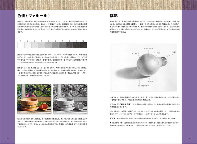 鉛筆&木炭デッサンに使う道具と画材をはじめ、鉛筆の角度から光と影の描き分け、スミの濃淡で立体的に見せる方法など、基本的なテクニックの解説つき。巻末には著者の作品集も収録しています。