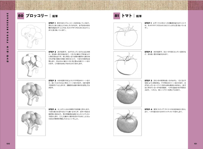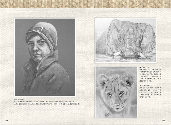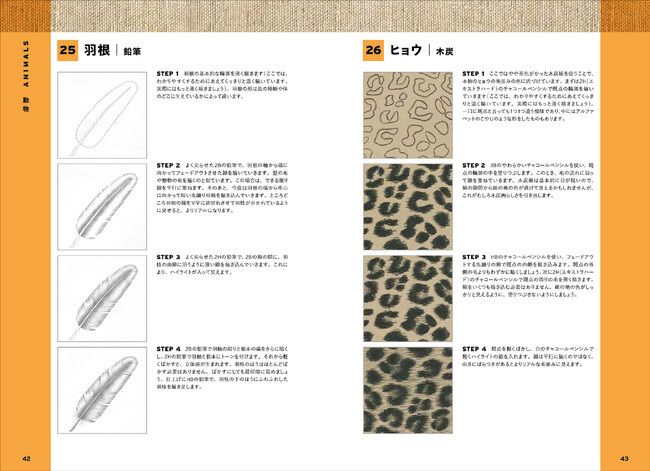 鉛筆や木炭でさまざまな質感(テクスチャー)を表現する方法について、オブジェクトごとに4ステップでポイントを解説。本書の真似をして描くことで、毛質・肌質の描き分け、ガラス・陶器・布といった質感の違いなど、素材ごとの描写のコツがつかめます。