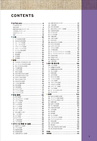 1.まずはじめに(道具と画材、テクニックと混色)/2.人物/3.動物/4.布地・織物/5.ガラス・石・陶器・木・金属/6.食べ物・飲み物/7.自然/作品集