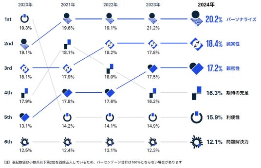 Six Pillarsの6つの要素のなかで、過去4年間にわたって最も重要度が高いと評価されたのは「パーソナライズ」で、生活者が自分自身のニーズや価値観、ライフスタイルに最適化された顧客体験を求めていることがうかがえます。また、2021年からの3年間に「誠実性」と「親密性」の重要度が増す変化が見られ、今回の調査においてもそれぞれ順位を維持しており、企業・ブランドに対する信頼や共感などの情緒的な価値を大切にする価値観が定着した可能性がうかがえます。