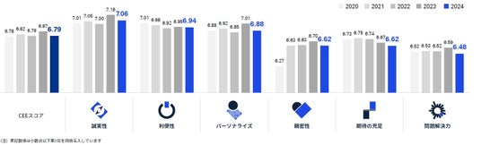 2024年の日本の調査対象ブランドの平均CEEスコアは、前回比-0.08ポイントの6.79となりました。Six Pillarsのすべての要素でCEEスコアが前回比で低下しており、特に「パーソナライズ」「問題解決力」「誠実性」の低下が顕著に現れました。CEEスコアの全体的な低下には、顧客体験における生活者のニーズや期待と、実際に企業・ブランドが提供するサービスとの間でギャップが生じたことが影響したと考えられます。