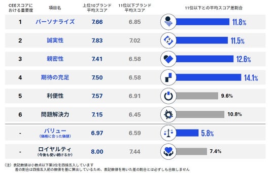 CEEスコア上位10のブランドと11位以下のブランドのSix Pillarsの平均CEEスコアで最も差が大きいのは「期待の充足」で、次いで「CEEスコアにおける重要度」が高いと評価された「パーソナライズ」「親密性」「誠実性」が続きました。
