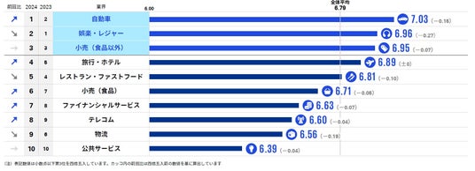 今回の調査では、「自動車」が最も高い評価を得ました。自動車業界は前回の調査から対象に追加され、前回の2位から順位を上げ1位を獲得しました。2位は「娯楽・レジャー」(昨年は1位)で、3位には「小売(食品以外)」(昨年は3位)となりました。一方、「物流」は昨年の6位から順位を大きく下げ9位にランクしました。