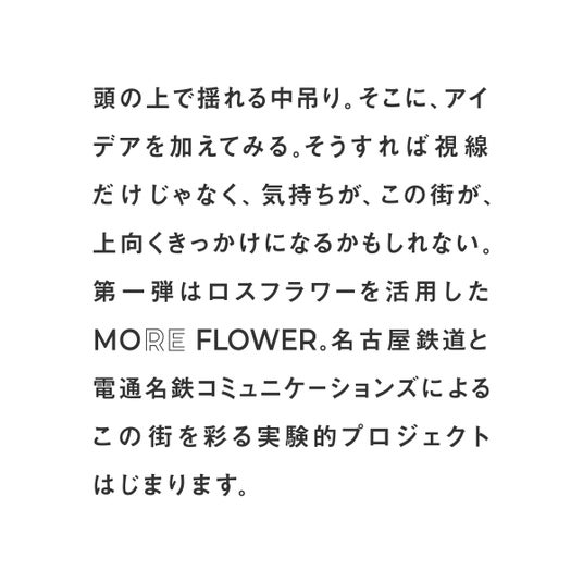 第1弾の「MORE FLOWER」を皮切りに、従来の中吊り広告ではなかったアイデアある中吊り広告を制作していきます。中吊り広告の新しい価値を作っていくとともに、中吊り広告を見上げることで世の中がうわむくようなメッセージを発信していきます。