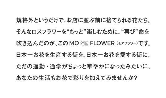 花卉(かき)生産農家から出荷された花がさまざまな理由で消費者の手に渡らずに廃棄されてしまうフラワーロスは、経済的損失だけでなく環境問題の一つとなっています。「MORE FLOWER」では、ほんの少し茎が曲がっていたり、予定より早く咲いてしまったりしたために、捨てられるはずだった規格外の花を生まれ変わらせます。