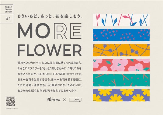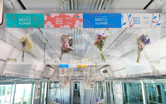 規格外の花を農家から買い取り、ドライフラワーにアップサイクルすることで新たな価値を生み出しているドライフラワーフローリストの「merry_go_round(メリーゴーラウンド) 堀 祐次郎氏」と連携し、運行する1編成内で真空パックに入れたドライフラワーを使用した中吊り広告を掲出します。「MORE FLOWER」によって車内が彩られるだけでなく、車内掲出後に再度回収してご希望の方に持ち帰っていただくことで、ご家庭でも花を楽しめる機会を生み出していきます。