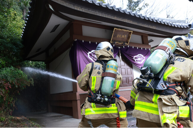 火災から文化財を守ることを目的に定められた1月26日の「文化財防火デー」を前にした、令和6年1月22日(月曜日)、同市内の安岡寺で、高槻市消防本部の消防隊員や同寺関係者、地域住民ら約20人が参加して防火訓練を実施しました。