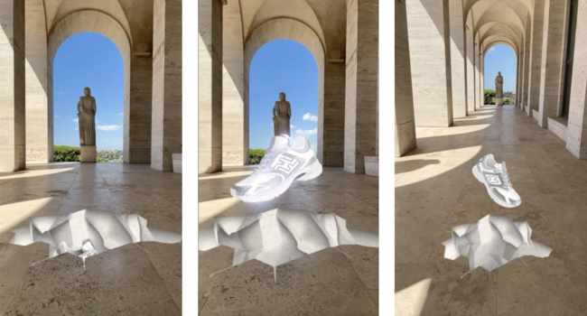 今回公開されたARコンテンツ「ファスター バイ フェンディ(Faster by Fendi)」は、「フェンディ ファスター」を探す宝探しへと人々をいざなう体験を提供し、Instagramのストーリーズとリールでご利用いただけます。スマートフォンでARプログラムを起動してスクリーンをタッチするとエフェクトが開始され、ユーザーは自身がいる環境の中で、手を使いながらバーチャルで遺跡を発掘することができます。まるで埋もれていた宝物を発見するかのようにいくつもの断片を掘り起こし さらに続けると「フェンディ ファスター」スニーカーが現れます。とりわけ革新的なのは、手の動きを読み取る「ハンドトラッキング」と、リアルとバーチャルをシンクロさせる「ミックスドリアリティ(複合現実)」において、実に自然でリアルな動きを体験できる高度な機能です。光や質感、さらには反射まで、実物を完全にデジタルで再現したスニーカーが驚くほどの高解像度で目の前に現れます。