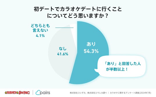 イベントの開催に合わせて両社は、ペアーズのアプリで同じ趣味や価値観のお相手を探すことができる機能「マイタグ」でカラオケ関連のタグに登録しているユーザーと、カラオケまねきねこ会員アプリのユーザーの合計10,614人を対象に、「カラオケに関するアンケート」を7月に実施しました。その結果、「初デートでカラオケデートに行くことについてどう思いますか?」という質問に対して「あり」と回答した人は半数以上の54.3%でした。その理由は「カラオケが好きだから」が27.6%、「話さなくても盛り上がれるから」が27.2%で、「私の歌を聴かせたいから」「コストパフォーマンスがいいから」といった回答もありました。