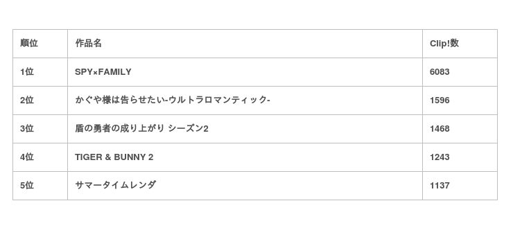 FilmarksのClip!数(ユーザーが観たいアニメとして登録した数)を集計し、ランキング化したもの(Clip!は1作品につき1メンバー1件まで)。